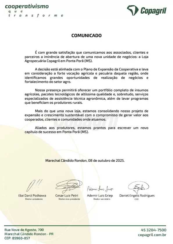 Copagril avança no Mato Grosso do Sul e inaugura nova unidade em Ponta Porã