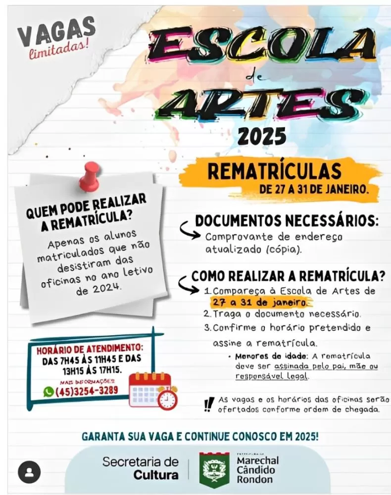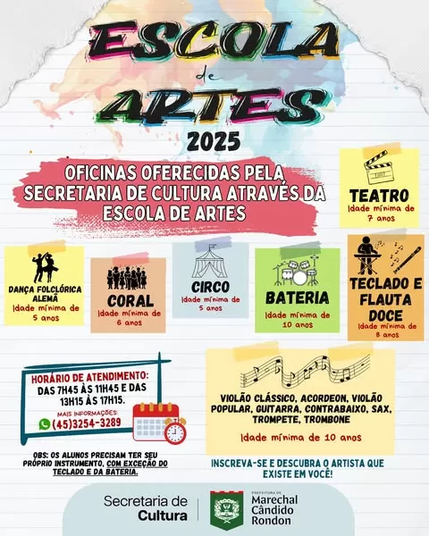 Inscrições abertas: Escola de Artes de Marechal Cândido Rondon inicia período de rematrículas