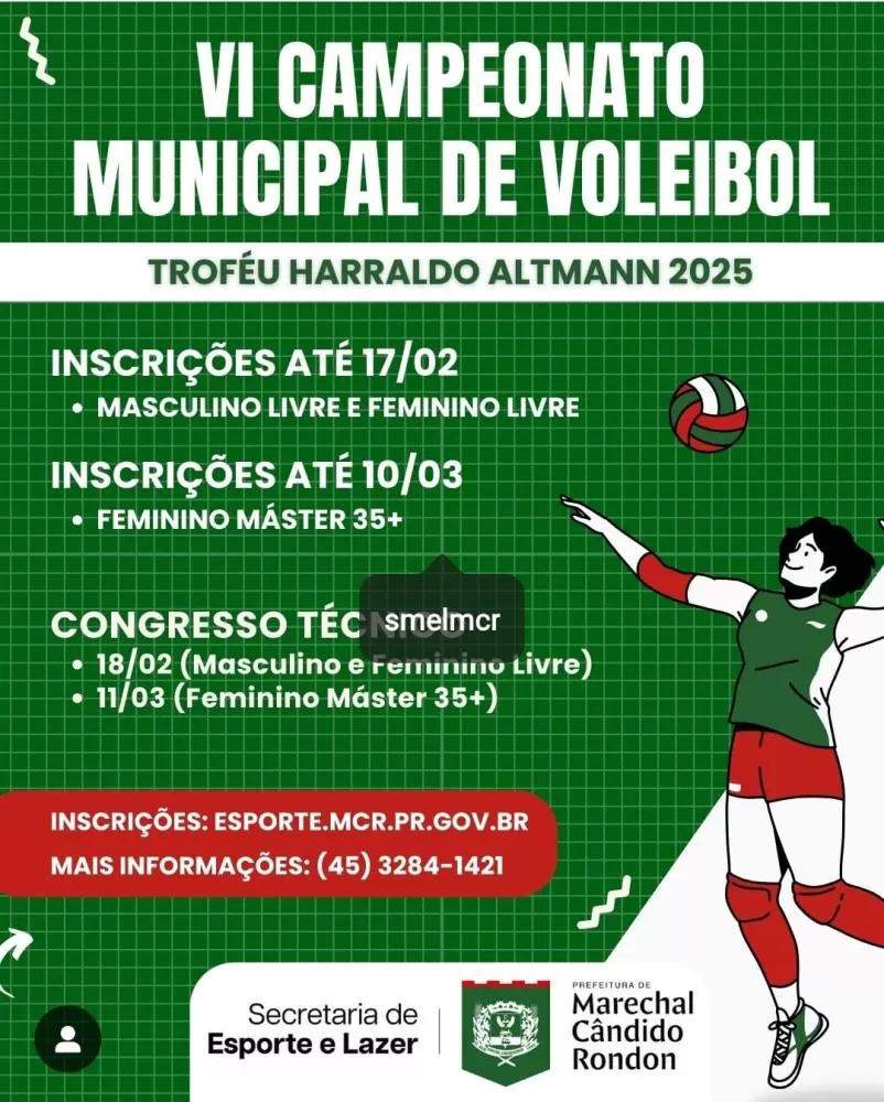 Inscrições para o campeonato municipal de voleibol, encerram nesta segunda feira dia 17