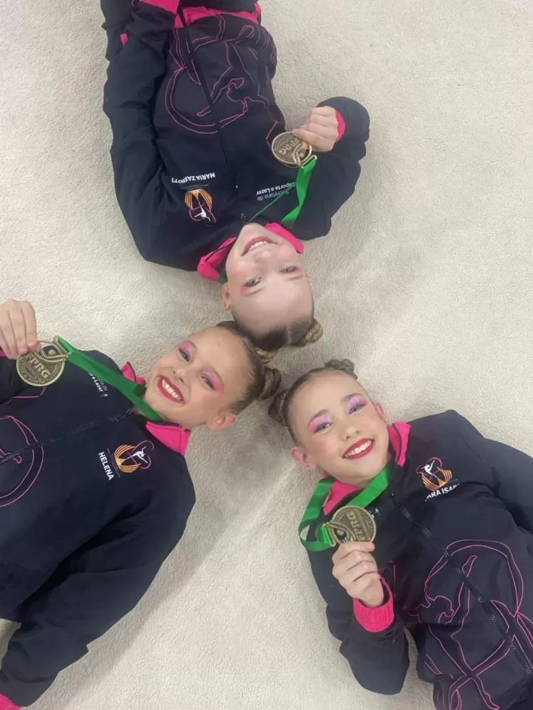 As ginastas Maria Eduarda, Helena e Lara encantaram o público e os jurados com uma apresentação marcada pela técnica apurada, sincronia e expressividade, que garantiram ao trio o primeiro lugar na competição. O desempenho do grupo é resultado de meses de dedicação e treinos intensos, orientados pelas professoras Vivian e Karine, que acompanham de perto a evolução das atletas e comemoraram com emoção o título estadual.