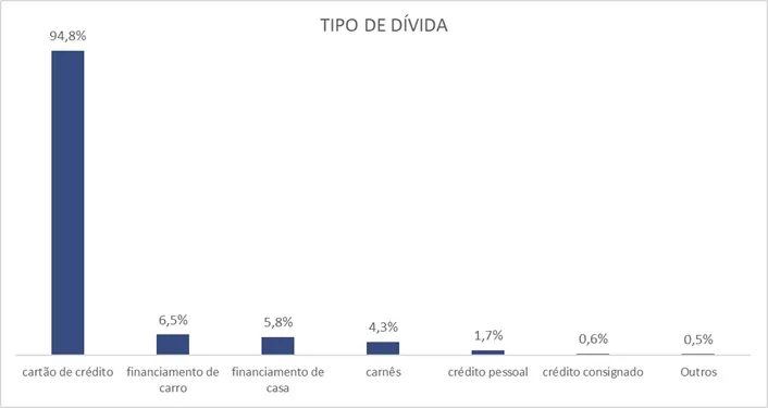 O cartão de crédito continua sendo o principal tipo de dívida no estado, representando 94,8% dos casos, ligeiramente abaixo dos 95,1% registrados no mês anterior.