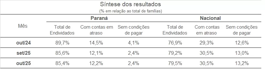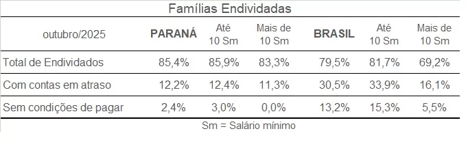 O nível de endividamento das famílias no Paraná permaneceu estável em outubro, alcançando 85,4% dos lares, de acordo com a Pesquisa de Endividamento e Inadimplência do Consumidor (Peic), elaborada pela Confederação Nacional do Comércio de Bens, Serviços e Turismo (CNC) em parceria com a Fecomércio PR. Apesar do alto índice, o estado continua entre os melhores do país em capacidade de pagamento, com uma das menores taxas de inadimplência do Brasil.