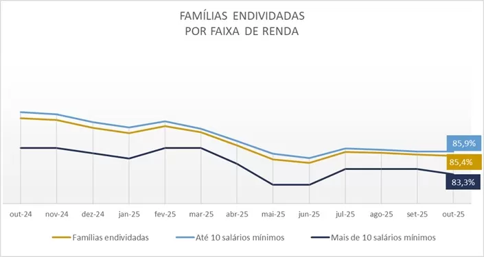 Entre as famílias com renda superior a 10 salários mínimos, houve leve recuo no indicador: 83,3% relataram possuir dívidas em outubro, ante 83,9% em setembro. Nesse grupo, 11,3% têm contas em atraso, mas todas afirmam ter condições de regularizar os débitos.
