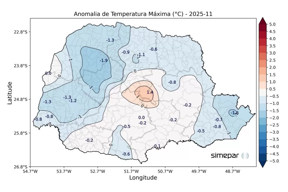O comportamento das temperaturas máximas reforçou a tendência: no Litoral e em quase todo o Oeste e Noroeste, os termômetros ficaram de 1°C a 2°C abaixo da média. Exceções como Guaíra, Altônia e Foz do Iguaçu permaneceram dentro da normalidade. Já Cândido de Abreu destoou, registrando 30,8°C - acima da média histórica de 29,5°C.