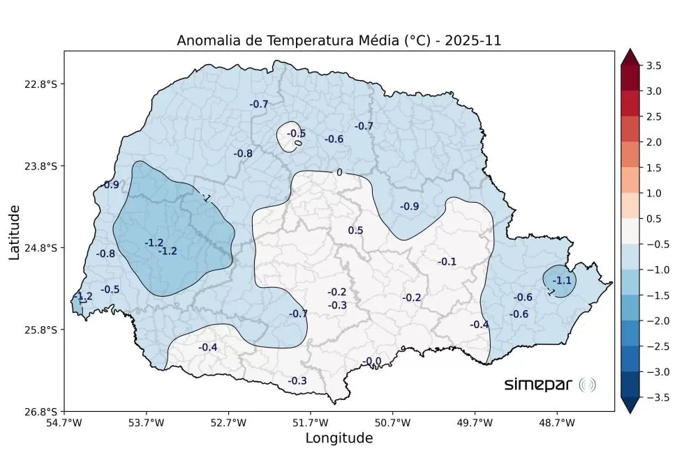 A maior parte do Paraná registrou temperaturas médias dentro ou abaixo do padrão histórico. Em localidades como Antonina, Foz do Iguaçu, Cascavel e Toledo, a média ficou até 1,2°C abaixo do esperado. Mínimas igualmente reduzidas - entre 1°C e 1,5°C abaixo da média - foram observadas em áreas de Joaquim Távora, Ibaiti, Telêmaco Borba, Guaíra, Assis Chateaubriand e Foz do Iguaçu.