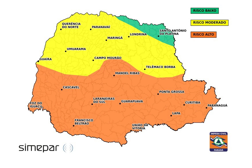 O Boletim de Gestão de Riscos do Simepar, elaborado em parceria com a Defesa Civil Estadual, aponta risco alto para tempestades com potencial de: