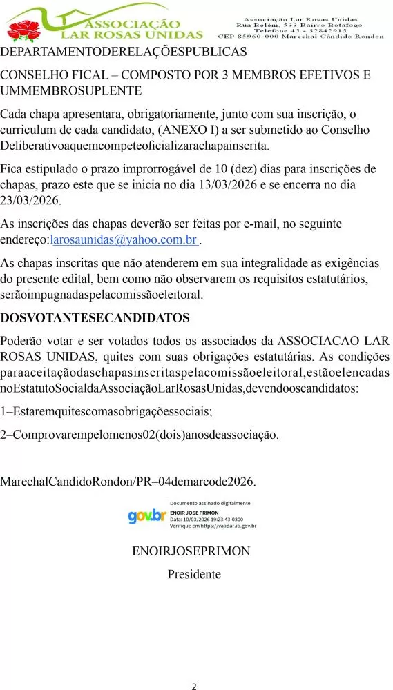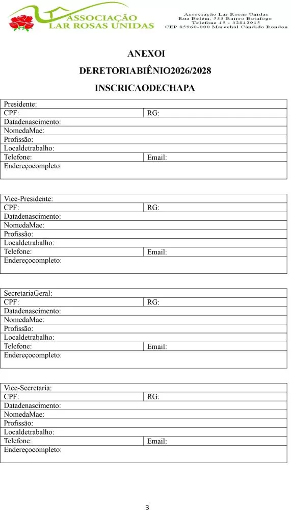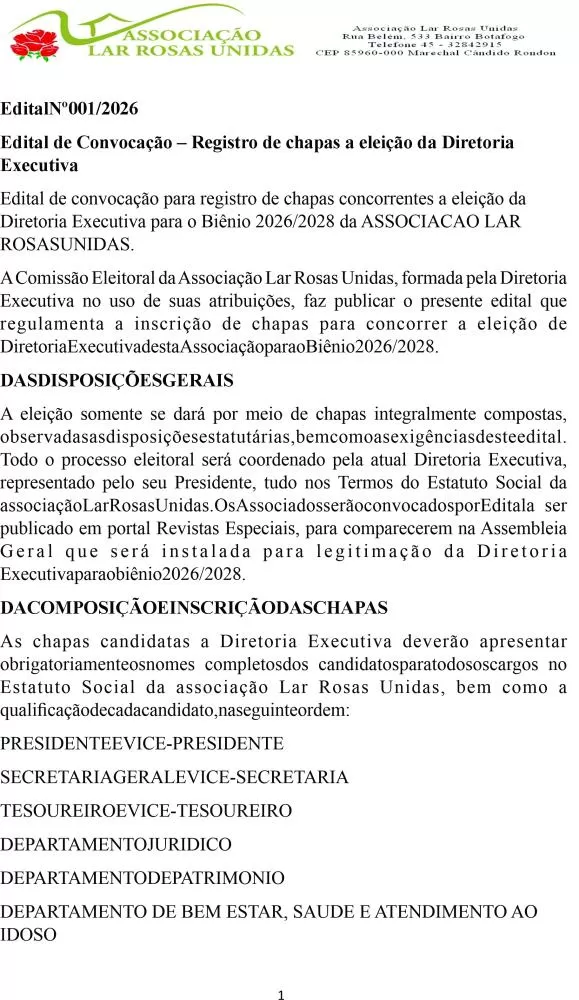 Edital de convocação para registro de chapas concorrentes a eleição da Diretoria Executiva para o Biênio 2026/2028 da ASSOCIACAO LAR ROSAS UNIDAS.