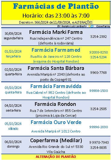 Plantão das farmácias do dia 30 de setembro a 6 de outubro