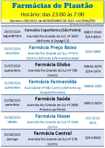 Escala de plantão das farmácias de Marechal Cândido Rondon